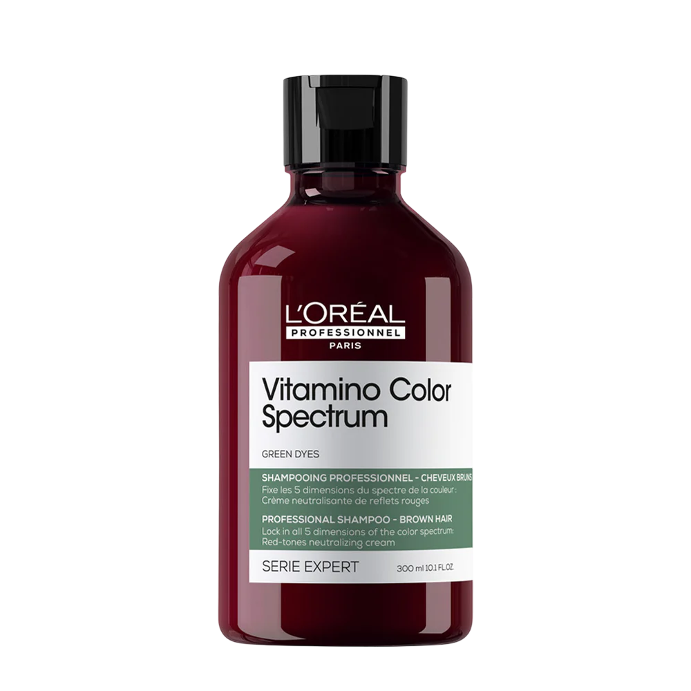Vitamino Color Spectrum Green Shampoo din gama Serie Expert de la L’Oréal Professionnel este un șampon profesional creat special pentru neutralizarea tonurilor roșii nedorite din părul șaten sau brunet vopsit.